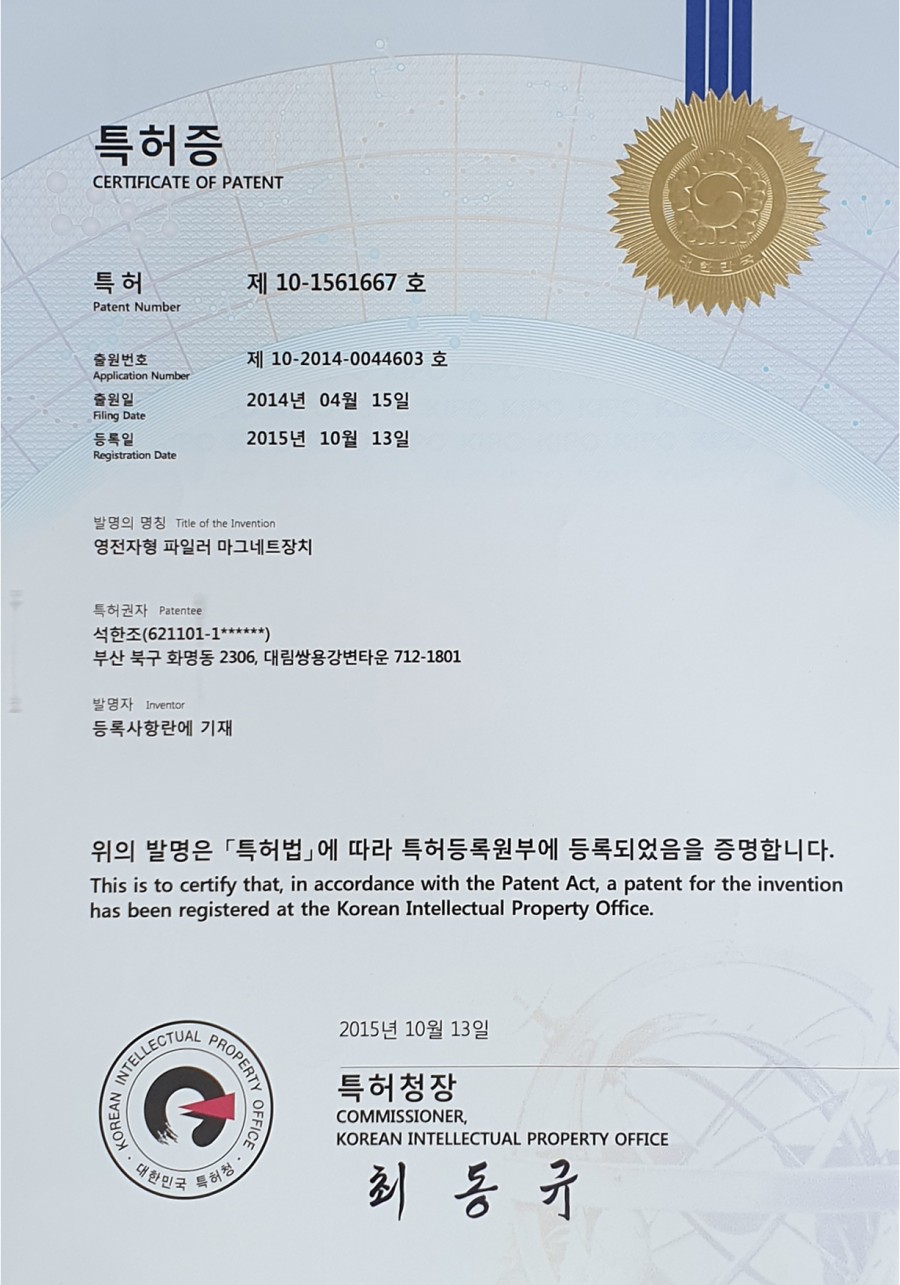 - 이전글특허증 -영전자 마그네틱 필터- 20.09.01